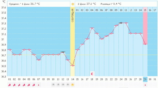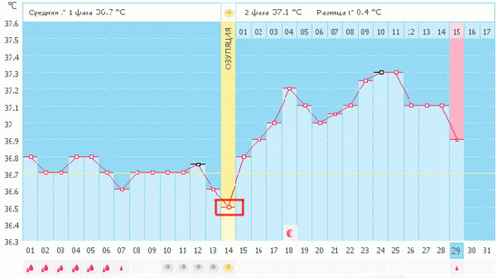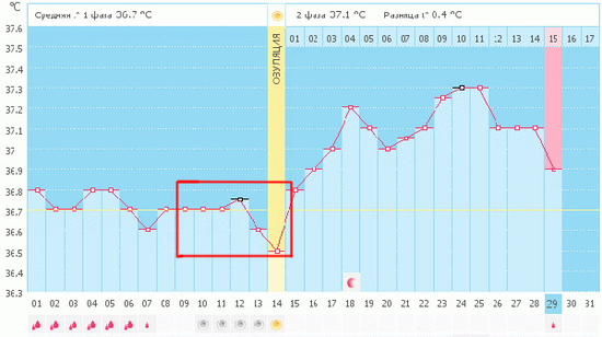 В идеале БТ первой фазы 36,0-36,6, во второй фазе 36,9-37,5. Перепад с низких на высокую БТ и называют Овуляция.