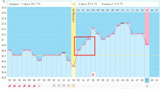Но для того, чтобы убедиться что овуляция действительно была, нужно проверить наступила ли вторая фаза, т.е. появление после предполагаемого дня овуляции высоких второфазных значений. Рассмотрим три дня, следующие за предполагаемым днём овуляции. В нашем примере это 15-17 дни цикла.