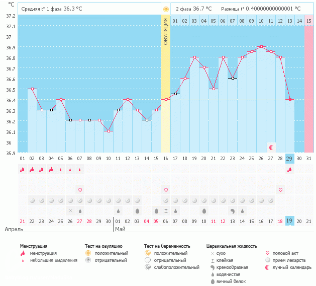 В первой фазе принимала кучу всего: лечились от уреаплазмы, лечила горло и кашель. Во второй фазе принимала Дюфастон с 16 по 25 ДЦ и с 18 по 27 ДЦ свечи Панавир иммуномодулирующие, еще витаминчики простые пью с 16 ДЦ (но это врятли как-то влияет). Там, где черное - не вовремя измерила или слишком мала или ужасно плохо спала, или все вместе. Вчера показывал разницу температур 0,5, среднее по второй фазе было 36,8. Сегодня пришли М. Нормальна ли длина второй фазы 12 дней? Читала, что норма как раз от 12, но на всякий случай еще вас хотелось бы спросить. В этом новом цикле начинаем активное планирование, как думаете будут ли шансы при таком же развитии событий в БТ? Да и в целом, что скажите по графику, как он себя ведет, учитывая принимаемые лекарства? Согласны ли, что была О и что она была на 16 ДЦ, как рисует график? Признаки (ощущение) О чувствовала 15-16 ДЦ. Сдавала прогик на 23 ДЦ был 4,4 нг/мл (норма лабы: 1,20-15,90 нг/мл). Если что, у меня в дневнике в "Базальная t°" полное описание цикла по дням, можете зайти, посмотреть, если нужна дополнительная информация. Писала очень подробно. Местами была ТТ до 37,2 вечером.
