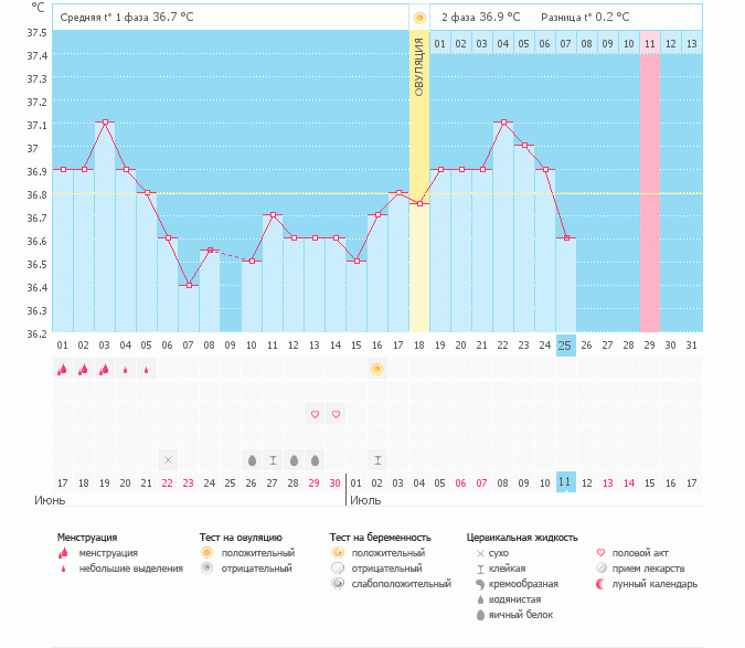 Вопросы и проблемы во ВТОРОЙ фазеГрафик базальной t°, цикл от 17 июня