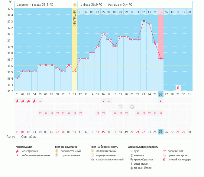 Хороший график) Овуляция снова на 11ДЦ.Все стабильно и цервикальная жидкость и интимная близость все во время.Удачи вам! Если в этом цикле чуда не произойдет-обращайтесь помогу.Кушайте больше сырых красных и оранжевых овощей и фруктов.То что в этом цикле не было кровяных выделений ни о чем не говорит-мы меняемся постоянно.
