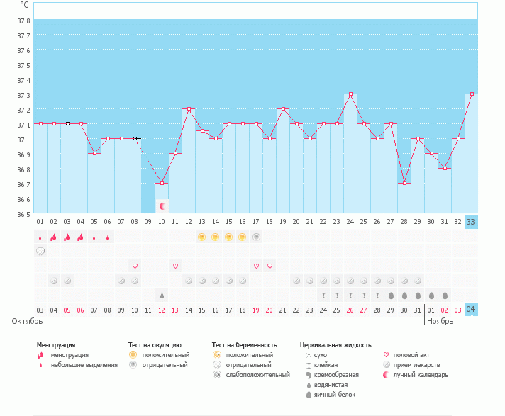 Беременность, признаки по БТ, есть ли шанс?Девочки, выкладываю свой график, не знаю была ли О, а может это сбой какой-то. Завтра должны быть М, а признаков никаких, только вчера на салфетке кровянистый сгусток и все.