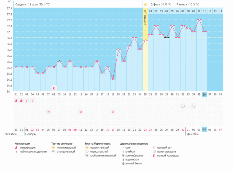 Но у меня теперь уже день О под вопросом! Просто у меня 19 ноября не получ. вовремя измерить Т (обычно меряю в 8, а 19 меряла в 5:50, и получилось 36.5, поэтому я в графике и не ставила это значение). А если поставить, то вот что получается: