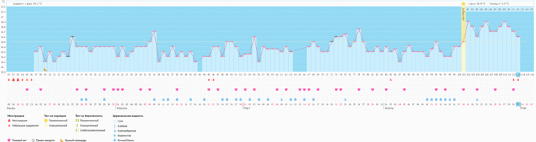 Беременность, признаки по БТ, есть ли шанс?На 112 и 113 дни помазало коричневым, а уже 1-го мая началась полноценная менструация... Единственное, что радует, что цикл наконец-то закончился. Всем девочкам, которые поддерживали меня - "Спасибо!", вы спасли меня от уныния... P.S. И всё таки мне кажется, что овуляция была на 97 - 98 день.