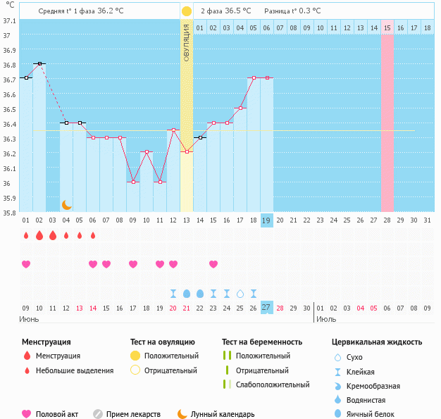 Изначально я поставила температуру. В тот день она была 37.5 , при темпе тела 37.1, так как я отравилась. Потом я убрала эта значение в программке, а так же и дни месячных поставила не учитывать и прога нарисовала мне О на 13 день.