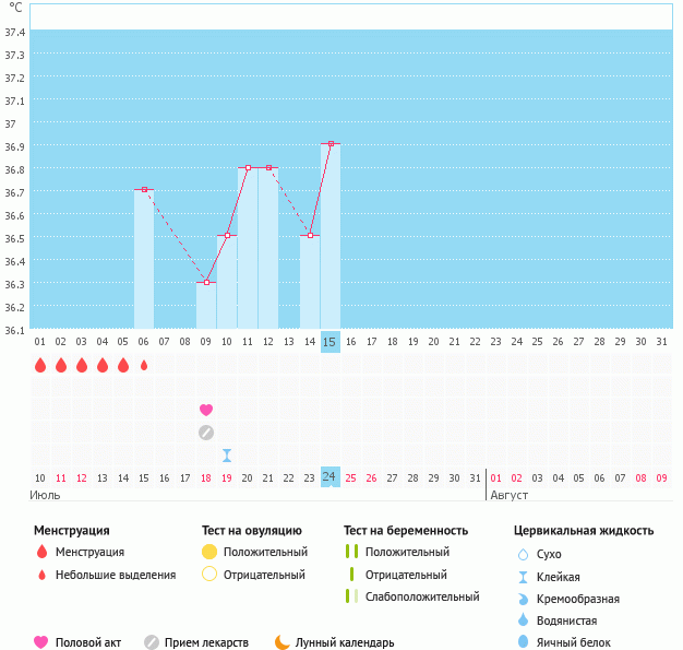 Мой график базальной t°, цикл от 16 июля 2015 Мой график базальной t°, цикл от 24 июня 2015