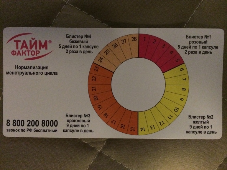 прикол в том, что курс приема тайм-фактора рассчитан на 28 дней строго, последняя капсула с медью и цинком (антистрессоры) принимается в теч.последних 5 дней цикла, а если цикл меньше, как у меня 24-25 дней, то я последние капсулы не успевала пропить. Надо самой схему было менять в теч.приема по циклу, подстраиваться, а гинек сказала пей как в инструкции..