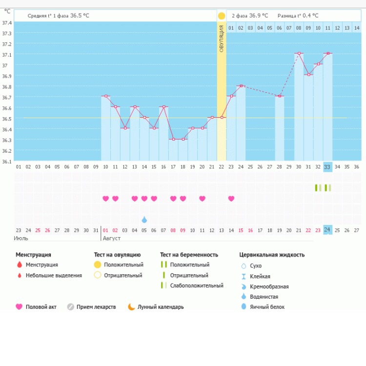 Ура! Мой график беременный!привет всем! Я тут новичок! Суть в том, что пока не хочу никому говорить дабы не сглазить, а поделиться очень хочеться. Да и мнение спросить у вас. Первые роды были 2008 родился пацан. Захотелось нам еще счастья родить. В марте этого года я забеременела. Но на сроке 7мь недель был самопроизвольный аборт с чисткой. Сказали эмбрион по размеру был на 4е недельки. Я так понимаю замер. Месячные у меня день в день были всю жизнь. Т.е этого же числа следующего месяца как по часам, 30-31 день цикл. Даже после выкидыша. В какой день почистили в тот день М и начинались. До беременности в марте я проверяла О по тестам она была четко в середине месяца на 14-15 ДЦ, сейчас странная ситуация в которой сама я разобраться не могу. Дело в том,что у меня всегла с середины цикла начинала наливаться и болеть грудь. И первая и вторая беременность у меня это был первый признак. Т.к перед месячными за 2-3 она сдувалась и переставала болеть, но при беременности она начинала болеть еще больше так я и узнавала о своем интересном положении. Сейчас у меня нет никаких ощущений после выкидыша у меня перестала реагировать грудь даже на овуляцию и сейчас тест рисует // а у меня совсем ничего не болит...... Для меня это не привычно просто. Поэтому составляя график впервые в жизни я подумала что цикл у меня ановулярный и Была уверенна что беременности нет. Но сегодня уже третий день задержки и слабая вторая полоска. Не маленькая ли вторая фаза у меня? Или овуляция была раньше? По ощущения живот тянуло 7-8 августа. Очень переживаю, боюсь повторения. Очень хочеться киндера. Может ли быть это гормональный сбой?! После выкидыша сдавала все анализы все в норме было, и при беременности перед выкидышем все анализы были в норме. Как вы думаете радоваться или пока рано?