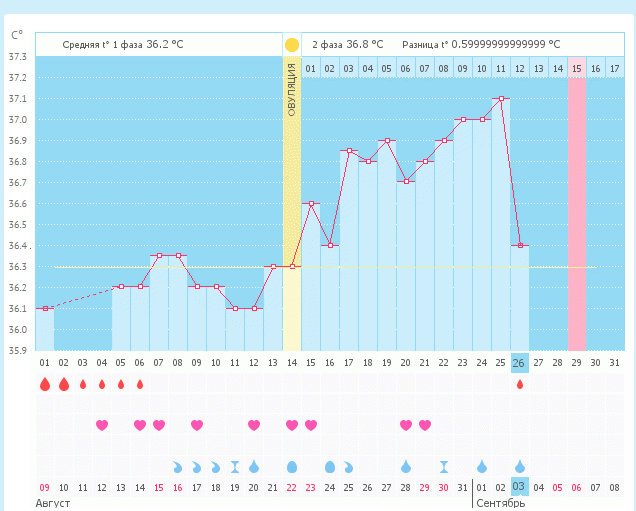 ОЦЕНИТЕ мой график! Всё ли в порядке?Девочки, привет! Кто хочет подсказать мне по графику? Как вам разница температур? И ничего, что вторая фаза не дотянула до 14 дней? У меня М пришли на 26 день цикла, как раньше. А три предыдущих месяца у меня цикл был по 30-31 день. Уже в следующий раз не знаю, чего ждать )) или не ждать )