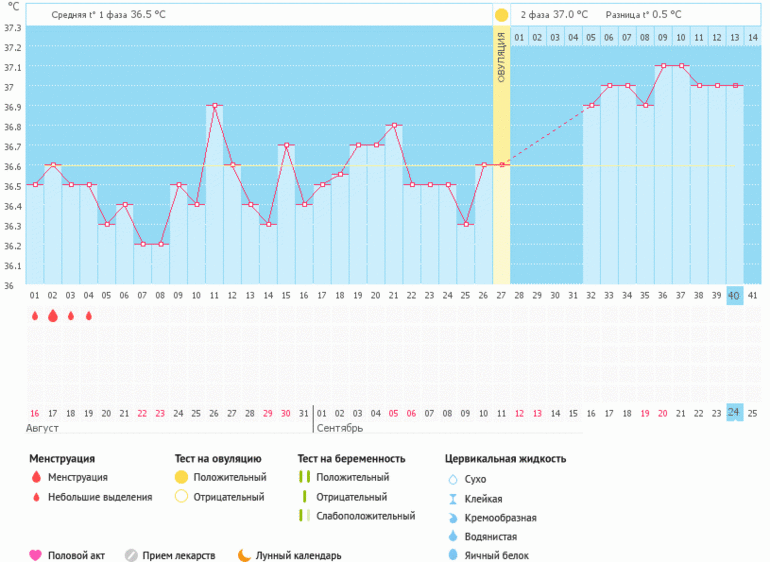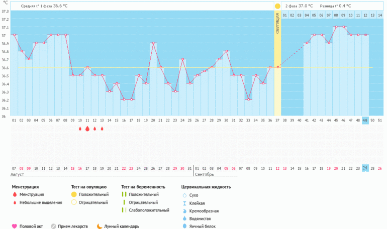 Что то не понятно по вашему графику когда у вас были М ??? У вас что в 1 день цикла t° 37???? Если всё таки ваш цикл начался 16августа, тогда разница температур в 1 и 2 фазе более чем 0.4. Попробуйте сделать уже тест. Б вполне возможна. Удачи!