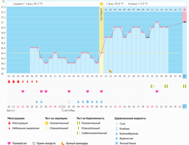 Черная точка - это я просто поставила галочку "не учитывать температуру", так как измерила ее не вовремя, хотя в данном случае это уже не имеет большого значения (это особенно важно для высчитывания овуляции). Насколько мне известно, в первом триместре БТ сохраняется несколько повышенная температура (около 37-37,5 градусов), а то время как в обычном цикле она падает или сразу перед началом месячных, или непосредственно в день месячных.