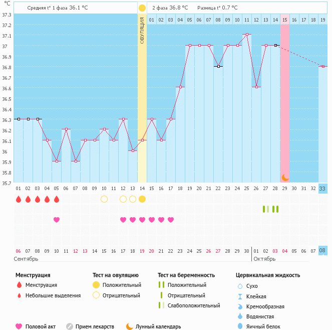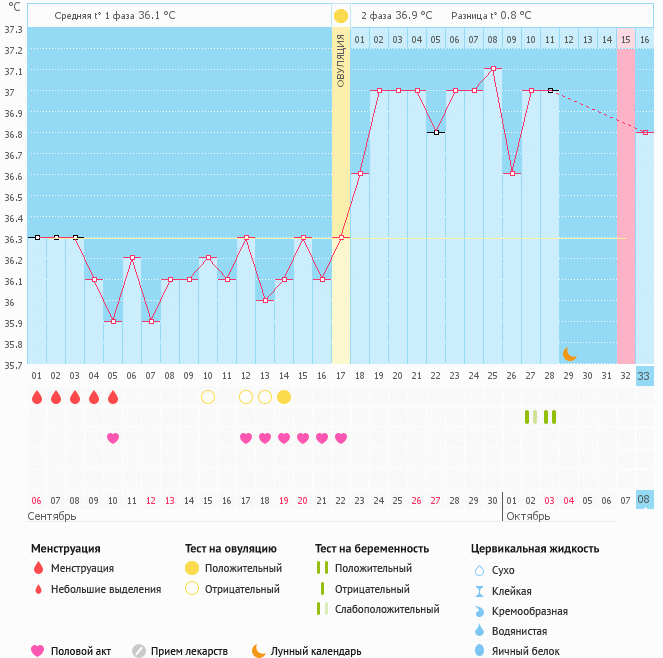 Однозначно этот график не похож на другие. Обычно разница температур у меня строго 0.4. Здесь разница больше. К тому же, это первый график, где разошлись показатели тестов и моих ощущений (о на 14 дц) и овуляции, которую выставила программа (17 дц). Поэтому я покажу оба варианта. Сама я доверяю графику с о на 14 дц. Специально просмотрела в телефоне длину своих циклов за последние пару лет: 27 и 28 дней, длиннее цикла не было.