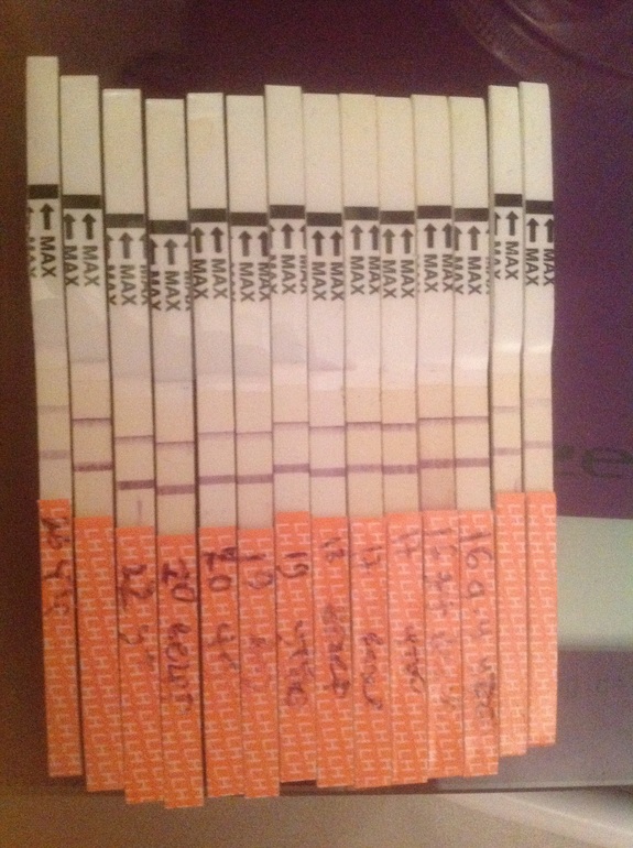 Делала тесты на овуляцию с 5 дц, постоянно слабее-сильнее, но полоска вторая была. Видимо это как-то связано с развитием кисты. сохранила только часть тестов, ниже с 15 дц. Два первых и один последний -тесты одной фирмы (фрау,она бледнее полосатится), в серединке другой ( хоум тест, полосатится ярче).