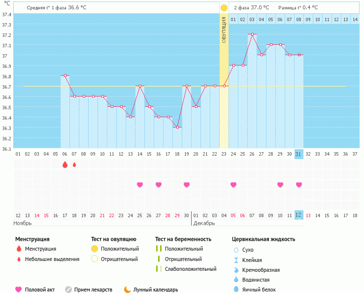 ОЦЕНИТЕ мой график! Всё ли в порядке?Девочки, что скажите? Была 2 дек на узи. Мне сказали, что по коственным признакам О. уже была, но желтого тела не видят, а вправом яичник немного житкости (1.3-как после о.) Хотя скачок температуры до 37.2 был 7 дек. Цикл на стабильный 28-32 дня.
