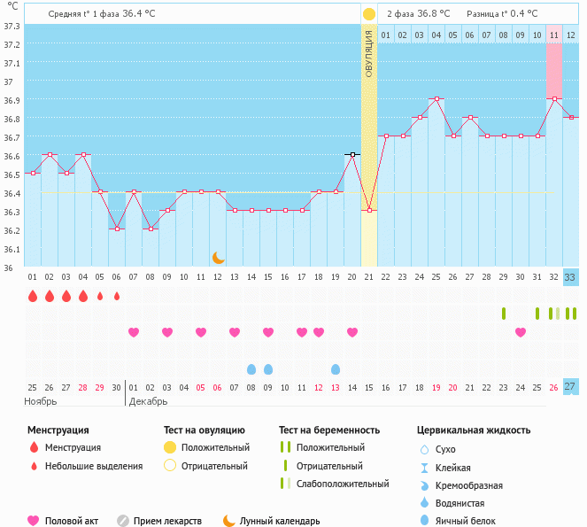 ну вот и мой беременный график)) возможно, кому-то будет полезен, учитывая, что у меня всегда была достаточно короткая вторая фаза, всего 10 дней и разница температур не больше 0,3. Что касается признаков, то я начала чувствовать, что все получилось еще на 5 ДПО: начало покалывать внизу живота, появилось стойкое отвращение к алкоголю (каюсь, не смотря на планирование, иногда позволяла себе по празникам бокал красного вина), начали болеть вены на ногах, один раз сильно затошнило из-за навязчивого запаха чьих-то духов. Ближе к дню Х все время болел живот внизу, тянуло, отстреливало в ПЯ (в кот. была О), хотя обычно у меня до монстров ничего не болело, начинал живот болеть только в первый день. Сегодня живот болеть перестал, но начало тошнить) Еще было очень больно во время ПА и тоже блже к монстрам стала очень чувствительна на запахи.Тест первый раз показал что-то крайне призрачное на 8 ДПО, это был ББ тест, но я тогда посчитала, что это реагент, т.к. читала, что они очень часто реагенят. На 10 ДПО сломали с мужем глаза об эвик, но прадеда призрака тоже уже увидели. а вот вчера-сегодня уже более-менее четкая полосочка, видна невооруженным глазом)) Завтра пойду сдавать ХГЧ и на всякий случай прогик, но мы уже супер-счастливы! все-таки удалось сделать мужу самый лучший подарок на новый год)) апчхи на всех, девочки))) всем новогодних чудес!)