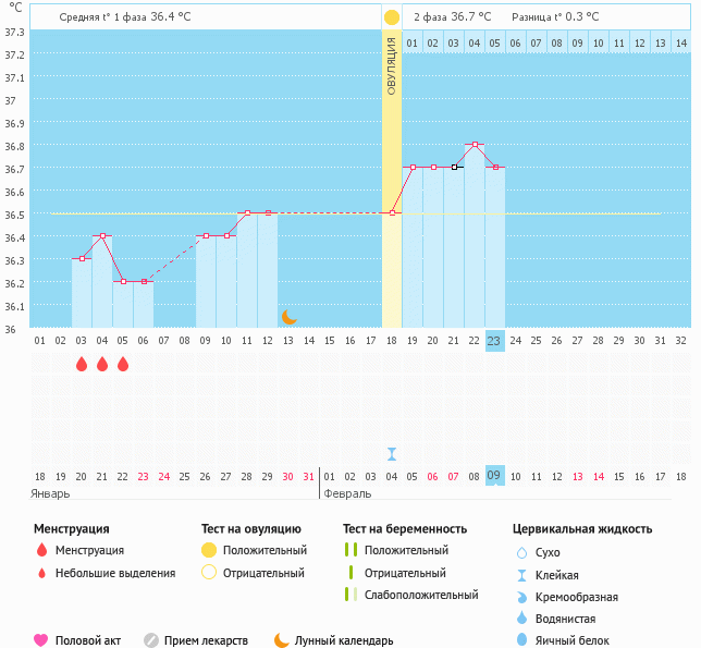 Я изучала много графиков (особенно беременных) и так не пришла к определенному выводу.Даже случались случаи что разница бт была 0.3 ,и во второй фазе не переваливала за 37 и все равно график был беременным.У меня разница воопще была 0.7.Здесь все индивидуально.Мерять надо хотя бы два цыкла чтоб знать именно свой организм,и изменения будут сразу видны вам. Я делала еще тесты на О.поэтому заметила что сразу после нее темп. начала подыматься.Сначала перед О. идет понижение а потом плавный скачек вверх. Скорейших вам исполнений желанного!!!