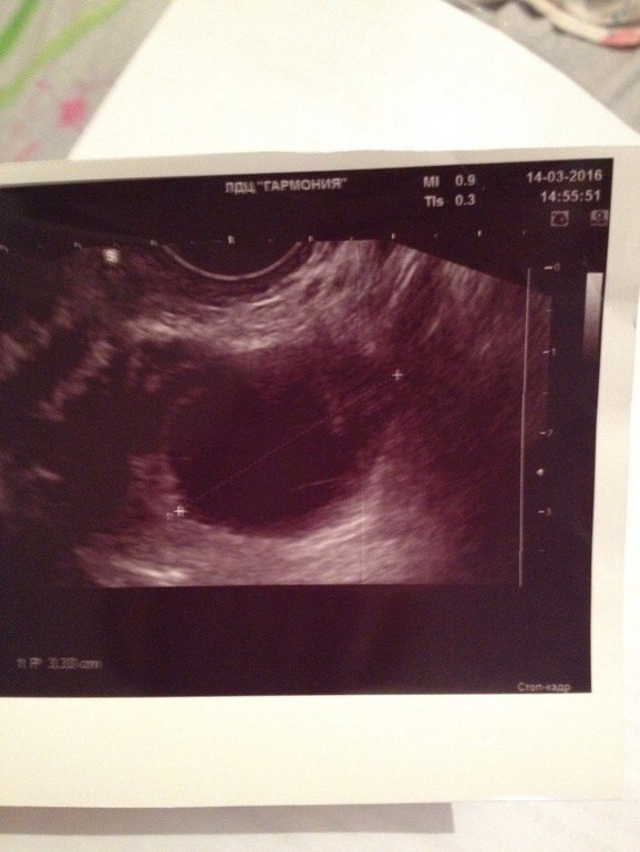 Если правильно вижу размеры-33мм(3,38см), то это не лопнувший доминантный фолликул, который перешел в фолликулярную кисту(функциональную). Овуляции не было. С началом месячных такие кисты проходят