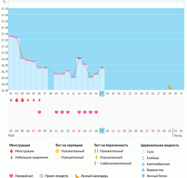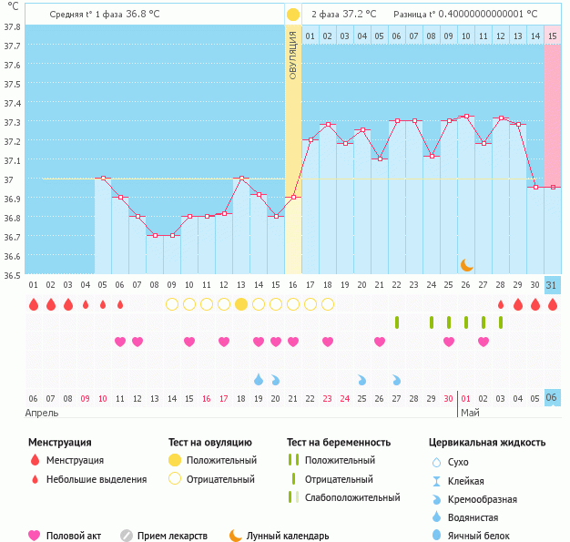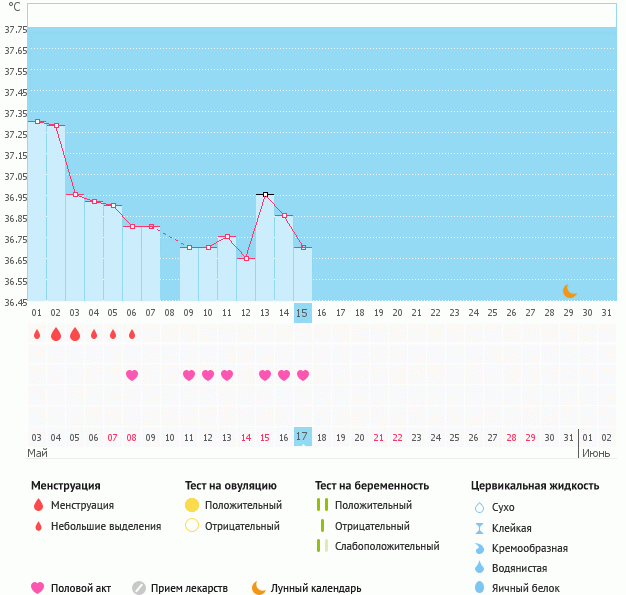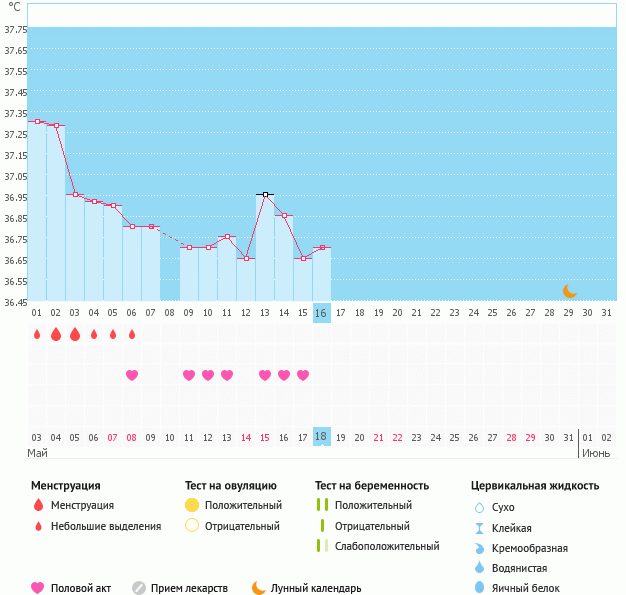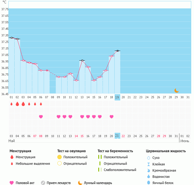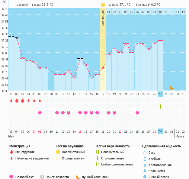 вобщем мужа вчера проводила на самолет((теперь я одна(((думала может чудо случится на этот раз,ан нет.двойное расстройство - и муж уехал и не беременна.жду М со дня на день,думаю придут 31 мая или 1 июня.вот мой график.кстати гормоны(Прогик,17-ОН прог.,пролактин,ТТГ),кот.сдавала все в норме.значит что-то с первой фазой,т.к.и темпа у меня высокая в 1 фазе.пойду теперь сдавать др.гормоны -ФСГ,ЛГ,Эстрадиол,АМГ и т.д. кстати и 2 фаза у меня получается короткая,в том цикле 11 дней.в этом будет также раз я чувствую М с 9 дпо.Вот такие у меня дела(((