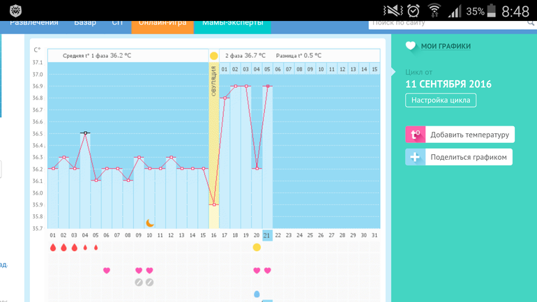 ГрадусникДевочки милые, подскажите, овуля по графику была на 16 дц, темпа поднялась до 36.9, у меня никонда выше не поднимается, а сенодня темпа резко вниз упала до 36.2, много ЯБ не могу понять что происходит, сделала овуплан тест на О а там две жирные полоски, как так? Две овули? Или график обманывает?