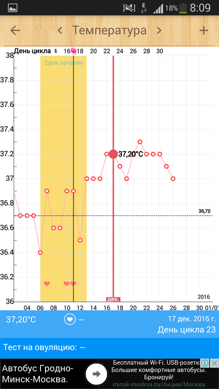 Анна Тимошенко в Графики базальной температуры 9 лет Мой график БТ , есть ли надежда??? Беременность, признаки по БТ, есть ли шанс? задержка 1 день Посмотрите еще 20 записей на эту тему Отменить Ответить Наталья Если завтра темп пойдет вверх.. то вероятность есть. Держу за вас кулочки 26.12.2016 Ответить Анна Тимошенко Спасибо, сделала тест пустой( 26.12.2016 Ответить Девочки! Кто разбирается по графиками! Посмотрите,пожалуйста! Мой график базальной t°, цикл от 22 ноября 2016 Чаты Беременных Выберите чат: Январята-2026 Февралята-2026 Мартята-2026 Апрелята-2026 Майчата-2026 Июнята-2026 Июлята-2026 Августята-2026