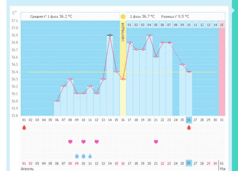 Я уже не понимаю, думала второй, третий, а температура с толку сбила. Просто неудачные беременности были, поэтому переживаю. Посмотрите мой прошлый график, там тоже, поднялась, потом опустилась, но я не верю, что на 16 дц была овуляция , цикл то всего 26 дней был.