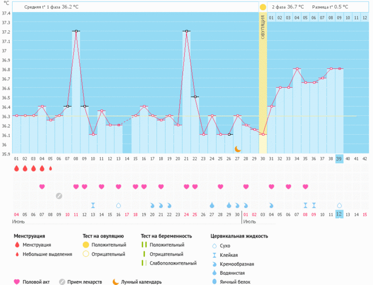 На 32 ДЦ доминантный фолликул 17,5. Ладно, думаю, мало ли почему БТ подскочила, в конце концов на 34 ДЦ у меня температура тела почти до 38 подскочила. Успокоилась - простыла просто, бывает. Но БТ не падает, выделений нет, грудь налилась - классика моей второй фазы.