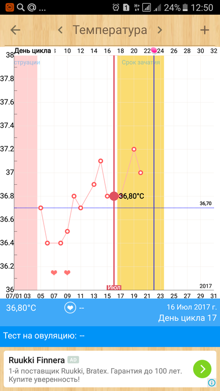 《Ника》 в Графики базальной температуры 8 лет Что можно сказать о графике. Была ли овуляция. Беременность, признаки по БТ, есть ли шанс? Посмотрите еще 20 записей на эту тему Отменить Ответить Katoshka вроде как на 9-10 д.ц. была, желаю удачи))) БТ хорошая))) 20.07.2017 Ответить Мой график базальной t°, цикл от 26 июня 2017 Мой график базальной t°, цикл от 26 июня 2017 Чаты Беременных Выберите чат: Январята-2026 Февралята-2026 Мартята-2026 Апрелята-2026 Майчата-2026 Июнята-2026 Июлята-2026 Августята-2026