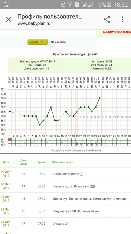Беременность, признаки по БТ, есть ли шанс?Вот такой у меня в этот раз не красивый график , температура поднялась только сегодня и то 36.9... ж т 3 дня назад было 13 мм (((.. первый раз такое маленькое причём с фолика больше 20 мм.. сегодня стала болеть грудь, может к месячным?? как думаете можно при таком ж т и температуре забеременеть? Месячные должны быть 6 -7 августа , но из за поздней овуляции график ставит их позже