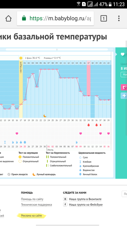Мария в Графики базальной температуры 8 лет Упала БТ Беременность, признаки по БТ, есть ли шанс? Девочки, сегодня совсем упала бт, это уже все, надежды уже никакой? Вообще вторая фаза 16 дней Посмотрите еще 20 записей на эту тему Отменить Ответить Ведана мама десятерых Скорей всего к мес 07.08.2017 Ответить Мария На море с детьми была, а во мужа с работы совсем не отпускают... эх.... 07.08.2017 Ответить Вася А вы предыдущий график покажите, у вас за сколько до М обычно температура падает? Может это имплантация. 07.08.2017 Ответить Мария уже сама вижу что тоже на 10 день начала падать...что-то я сама недогадалась на прогшлый график посмотреть 07.08.2017 Ответить Вася Ну на нём не так сильно падает на 10 день, а в свежем графике она у вас что-то прям ухнула. 07.08.2017 Ответить Мария Вот же.. что-то странно... буду ждать что завтра будет 07.08.2017 Ответить Вася Согласна с предыдущим комментарием, у вас сердечки чересчур далеко от О. 07.08.2017 Ответить Белка Надежда есть всегда! Если вторая фаза 16 дней, то темп еще может подняться....Но вот сердечки как-то далековато от О :( 07.08.2017 Ответить Мария Это да.... 07.08.2017 Ответить Мой график базальной t°, цикл от 15 июля 2017 Вопрос Чаты Беременных Выберите чат: Январята-2026 Февралята-2026 Мартята-2026 Апрелята-2026 Майчата-2026 Июнята-2026 Июлята-2026 Августята-2026