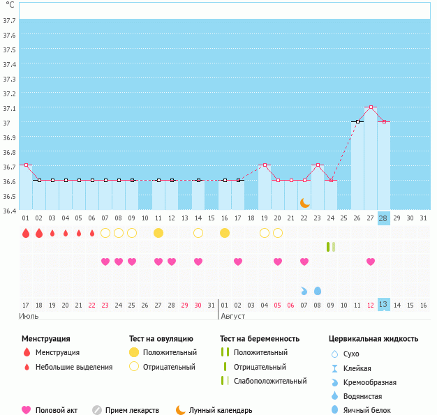 Но если смотреть на график 4 августа БТ низкая. Потом я решила что бестолку ее измерять. Но вот 11 числа меня черт дернул ее измерить и я вижу что она поднялась до отметки 37,1.
