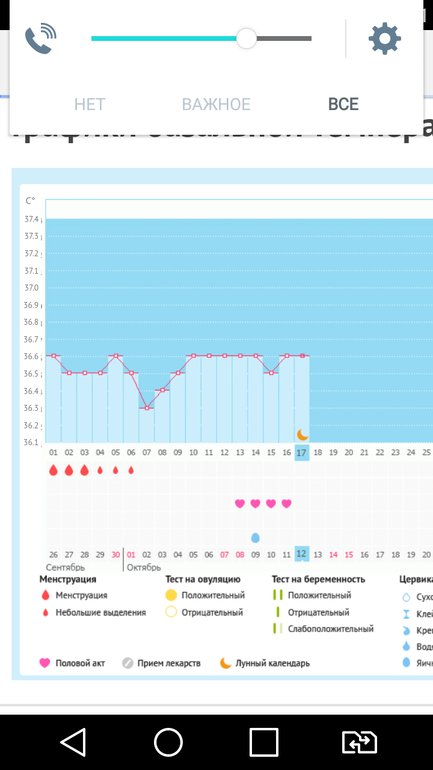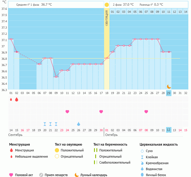 График вот такой получился. Я все таки думаю в этом цикле О не было, потому что уже сегодня мажет, завтра полноценные М начнутся. Для второй фазы слишком мало. Вот если бы цикл 32 дня был, то да, я бы согласилась, что О была. А вам желаю удачи!