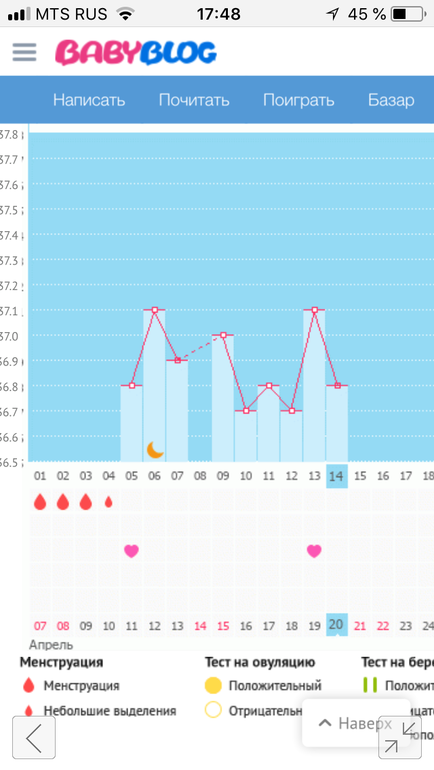 ХочУха в Графики базальной температуры 8 лет Дай бог нам // на тестах ! Беременность, признаки по БТ, есть ли шанс? Наш первый цикл после ОК и надежды и веры полные штаны 🤗 Была ли О или скоро будет ?!?! Посмотрите еще 20 записей на эту тему Отменить Ответить Маша Дай Бог скорейших //!!!! 22.04.2018 Ответить ХочУха Спасибо Машунь 😘 23.04.2018 Ответить Елена Смотря сколько сам цикл..От него нужно отталкиваться..А пока не понятно 20.04.2018 Ответить ХочУха Да и бт само после ОК , немного странноватое 21.04.2018 Ответить Елена Ну да..37 высоковато для 1 фазы 21.04.2018 Ответить ХочУха Эхххх😓 23.04.2018 Ответить Аннушка Пока нет О( 20.04.2018 Ответить ХочУха Вот и мне кажется 🤔 20.04.2018 Ответить Мария Удачи. Пока что-то непонятное. 20.04.2018 Ответить ХочУха Спасибо большое, вот не понятно, непонятно 🤔 20.04.2018 Ответить Мария После ок гормоны могут шалить, отсюда и скачки и высокая температура в начале цикла. 20.04.2018 Ответить ХочУха Спасибо Машунь 🤔 21.04.2018 Ответить График БТ до возвращения цикла после родов Всем привет!Помогите разобраться! Чаты Беременных Выберите чат: Январята-2026 Февралята-2026 Мартята-2026 Апрелята-2026 Майчата-2026 Июнята-2026 Июлята-2026 Августята-2026
