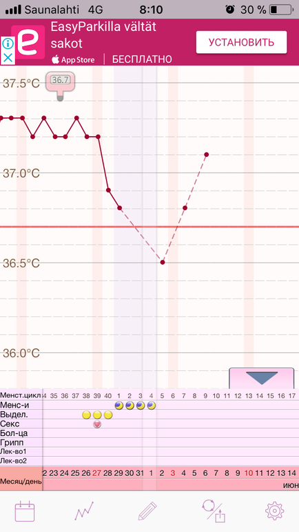 обычно от 36,4-36,6...в этом цикле вот так вот...во второй фазе больше 36,9 никогда !!!!не поднималась, поэтому сейчас я очень удивленна и рада, что все таки она выше 37 поднялась... приложение называется Flo очень удобное и интересное