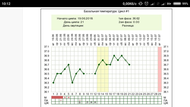 Беременность, признаки по БТ, есть ли шанс?КД были 19-23.06, па был на 3 и 8 дц.С 9 дц были ноющие боли и яб как при овуляции. Теперь вот смотрю на график и думаю когда была О? Обычно 1фаза у меня 36.3-36.7,вторая 36,7-37. Меня волнует то что уже 21 дц а бт ниразу не поднималась выше 37.Может О и небыло? Может ли быть беременность при такой бт