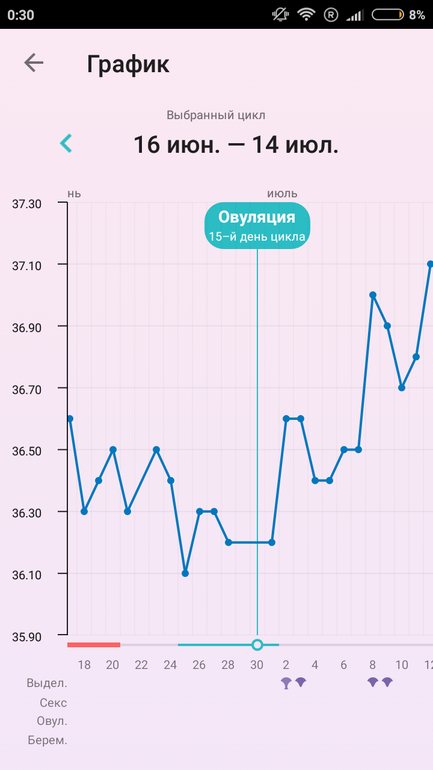 А как у вас по ощущениям было?сами замечали овуляцию?я просто как по книжке вижу и выделения и резкую разовую боль. А температура по базальным графикам у меня даже при беременности не была выше 37.гинеколог говорил,не знаю как с такой низкой БТ ты умудрилась забеременеть)