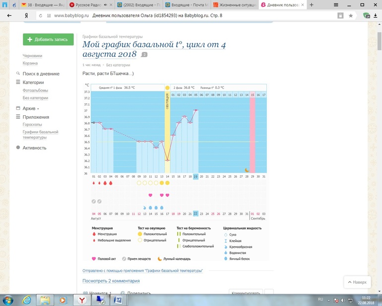 Всем доброго дня! Девочки, оцените график, пожалуйста, есть ли шанс на Б? Из признаков ТТ 36,8 (всегда 36,4), грудь очень чувствительная иногда прям такое чувство, что молоко приходит))) помню как это бывает))) Всем спасибо!