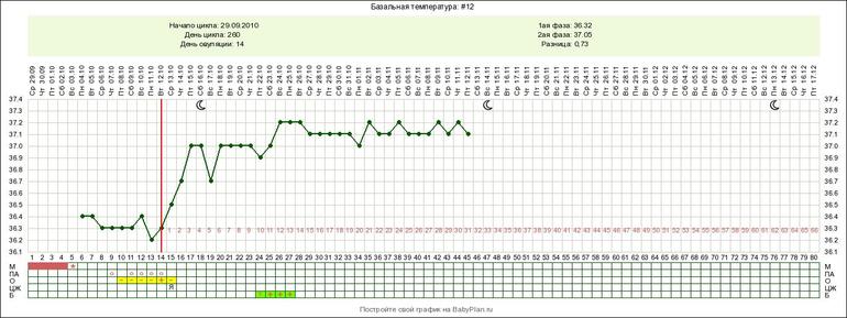 И вот её беременные циклы, закончившиеся родами. В первом случае один ребенок, во втором близнецы. Разница средних температур больше 0,7.