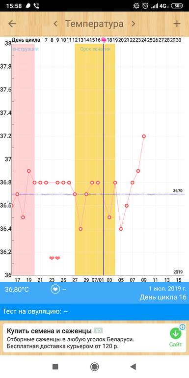 Алена К в Графики базальной температуры 6 лет Девчонки,была ли овуляция?!! Беременность, признаки по БТ, есть ли шанс? Посмотрите еще 20 записей на эту тему Отменить Ответить Татьяна 7 была, скорей всего по графику 09.07.2019 Ответить Анастасия Была, 07.07. 09.07.2019 Ответить Мария Солнце Была) 5 июля, судя по графику. 09.07.2019 Ответить Алена К даже если она не резко поднялась,можно считать что была,да? 09.07.2019 Ответить Мария Солнце У меня она всегда ступенчато поднимается 09.07.2019 Ответить Мой график базальной t°, цикл от 18 июня 2019- 7-ой цикл планирования Девочки, как думаете есть шанс? Чаты Беременных Выберите чат: Январята-2026 Февралята-2026 Мартята-2026 Апрелята-2026 Майчата-2026 Июнята-2026 Июлята-2026 Августята-2026