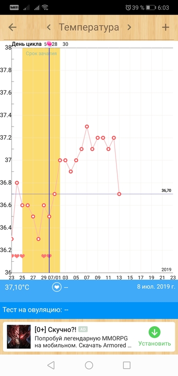 Менструация и БТНу вот и все... И я теперь жду М. Хотя так низко температура у меня ни опускалась. Поздняя О на 27 дц и график составил пока.. 40 дней, при цикле 28-30. Второй цикл такой(((