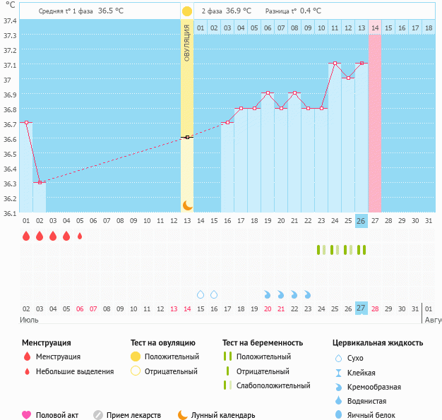 Беременность, признаки по БТ, есть ли шанс?Девочки гляньте график плиз! Ситуация такая.... цикл в седнем у меня 33 дня. Месячные были с 1 июля по 6 июля, 11 и 12 числа снова как буд то пошли месячные, но проявлялись только на бумаге после туалета со слизью (то есть выделения были слизистые обильные и плюс кровило, но не алой кровью а больше темной с коричневым). Затем 16 числа была овулька я ее хорошо чувствую(болел живот), 19 числа снова была овулька живот так же болел, но даже сильнее. Приложение овуляцию ставит 20 числа. Мой график прилагаю..может ли быть такой график беременный?