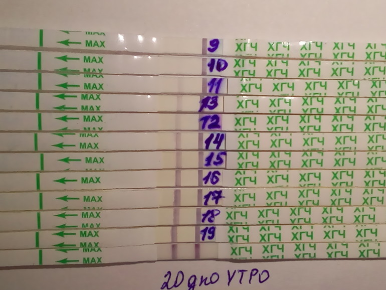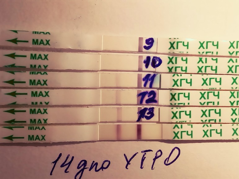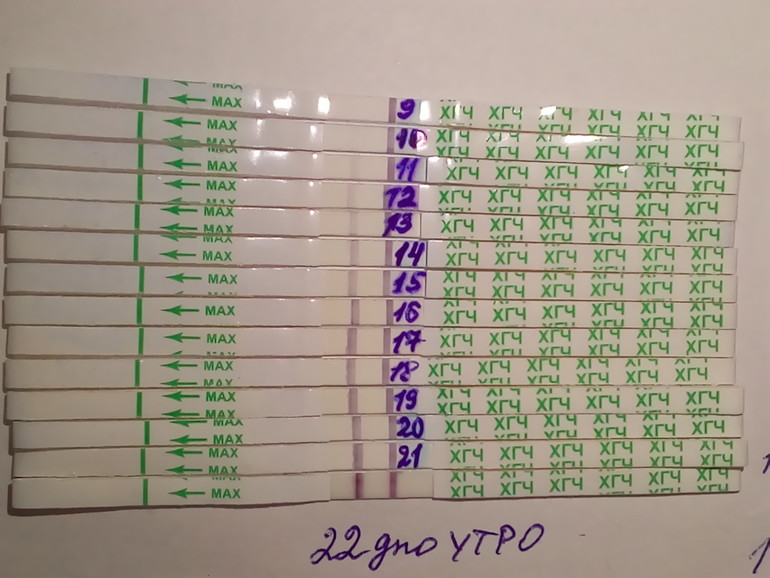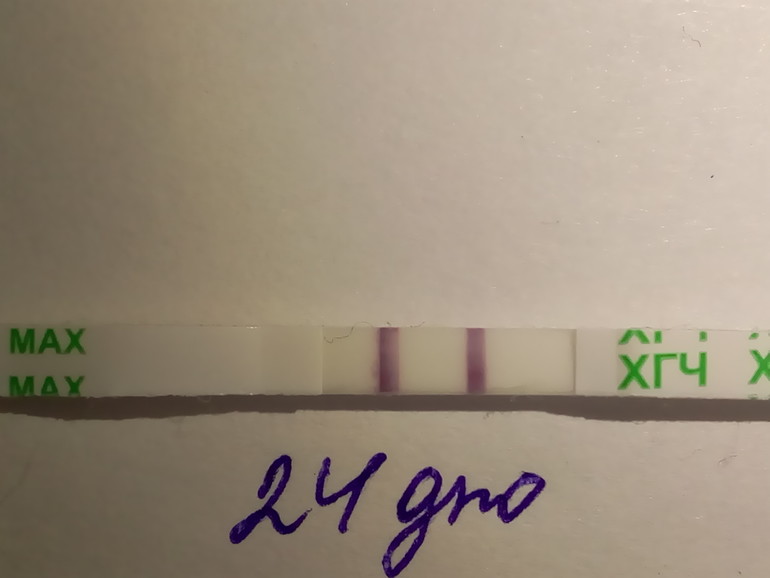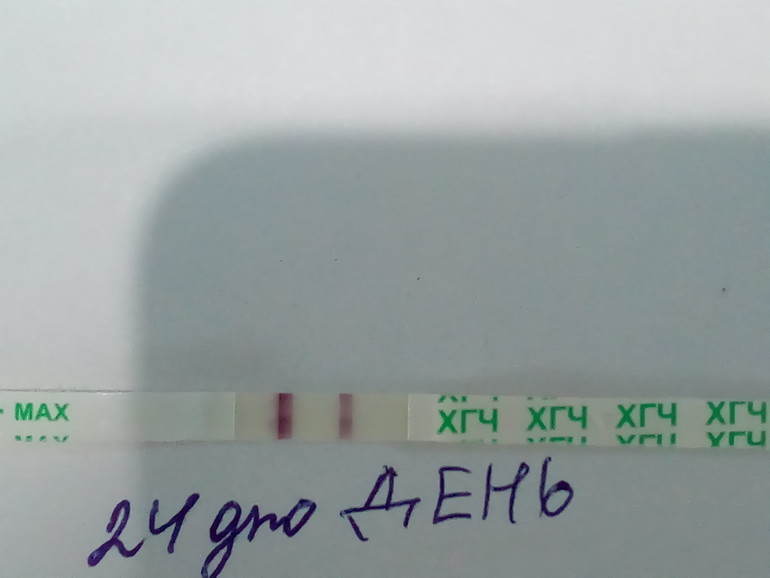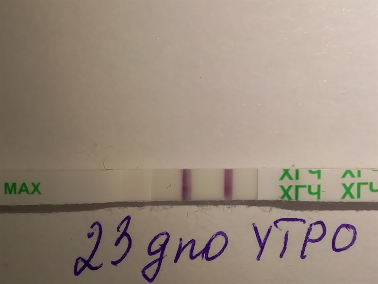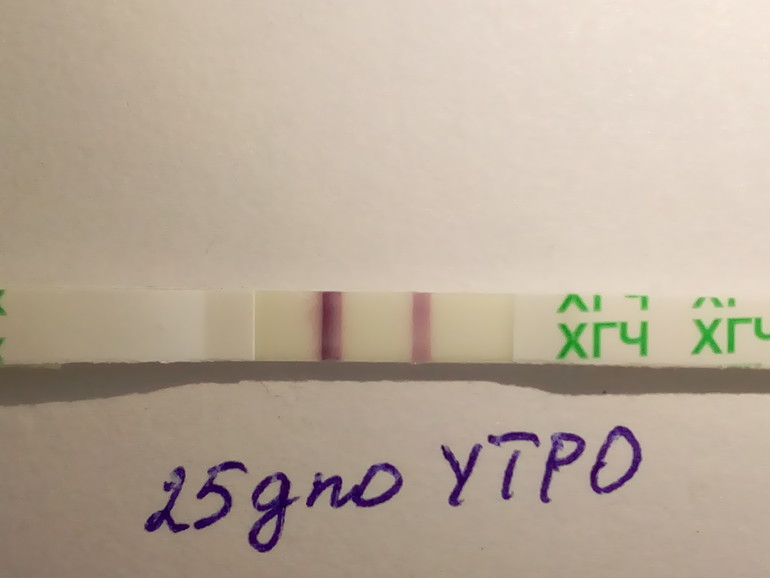 Тест на 25 дпо , теперь смотрим как бледнеет и пропадает контрольная полоска, тестовая достигла максимальной яркости, даже растекается