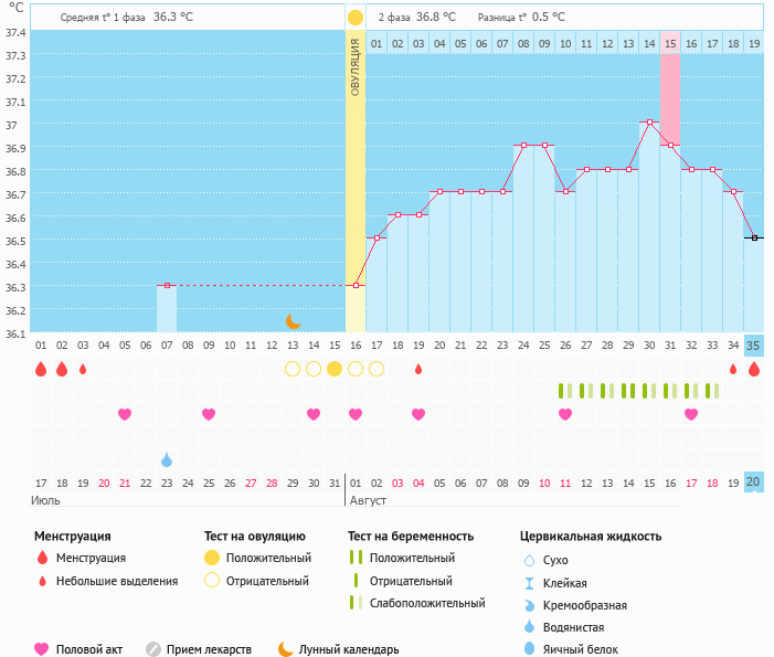 Вообще-то тоже хотела домерить до разницы в 0.4, ну, типа убедиться, что поднялась БТ и перестать. Она поднялась до 36.7, по идее от "стартовой" как раз 0.4, но там же среднее, график пишет 0.2, потом 0.3. И я сама смотрю и 36.7 уже кажется очень низкой, в заметках пишу "какая овуляция, такая и БТ :(". Хотя на самом деле померила для интереса вагинально - 36.9, то есть +0.2 к оральной, вполне себе хорошая БТ второй фазы.