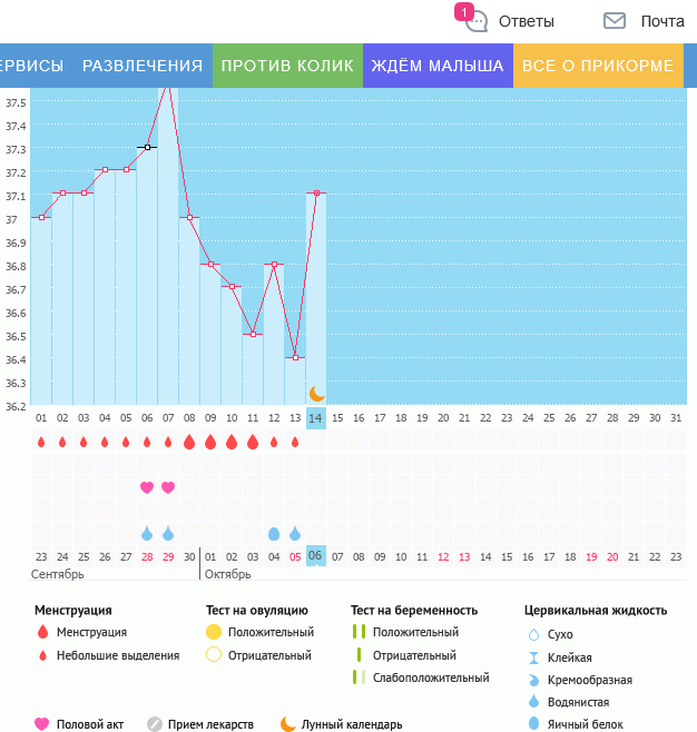 нижний построила именно с начала выделений. продолжение графика на Утрике. У меня сильное предположение,что там где температура скаканула до 37.6 ,вот там и была О. Уж очень сильные были выделения водянистые. Я в те дни начала заболевать это да,но ТТ у меня не было такой высокой,максимум 37 была тогда. Если была О тогда,то почему БТ пошла вниз потом.