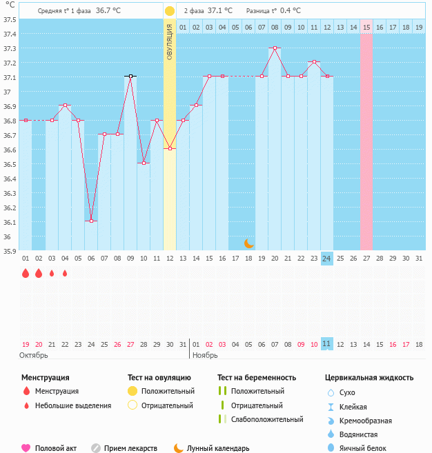 Вопросы и проблемы в ПЕРВОЙ фазеМой график в этом месяце меня радует. Хоть и первая фаза не очень и овуляцию обратно выставила сама программа не ставит. Зато меня радует вторая фаза для меня 37.1 это отлично.