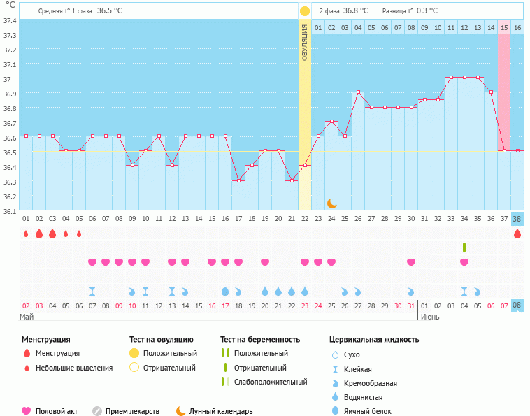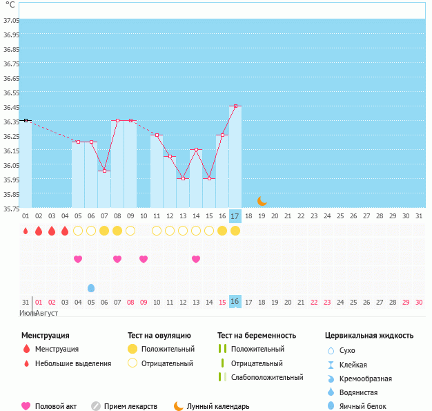 Вот для сравнения мой теперешний цикл, было повышение БТ 2 дня вначале, и даже ЛГ подскакивал, а потом вниз БТ пошла и вот только на 17дц О намечается))