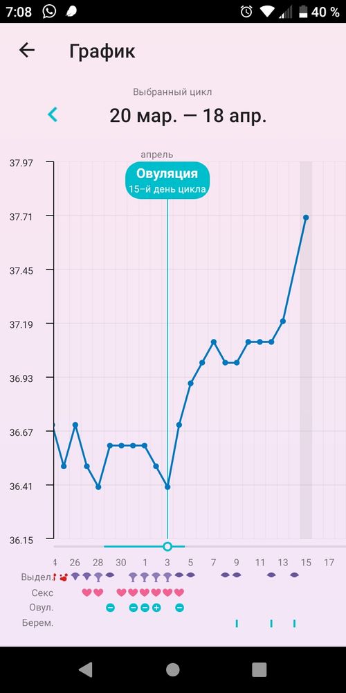 На 15 была,фолиикул такой на следующий день точно лопнул+ снижение бт обычно в саму овуляцию, ну по крайней мере из моих +100500 графиков, западение бт именно в овуляцию было,а потом скачок на 0,3-0,4 градуса