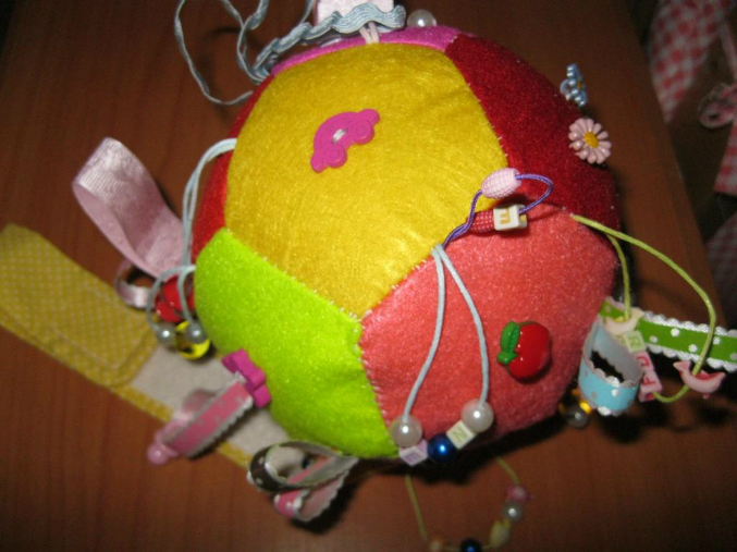 мяч представляет собой 12 разноцветных пятиугольников из фетра, подвески крепко закреплены внутри мяча и состоят из бусин, различных пуговиц, подвесок, лент.