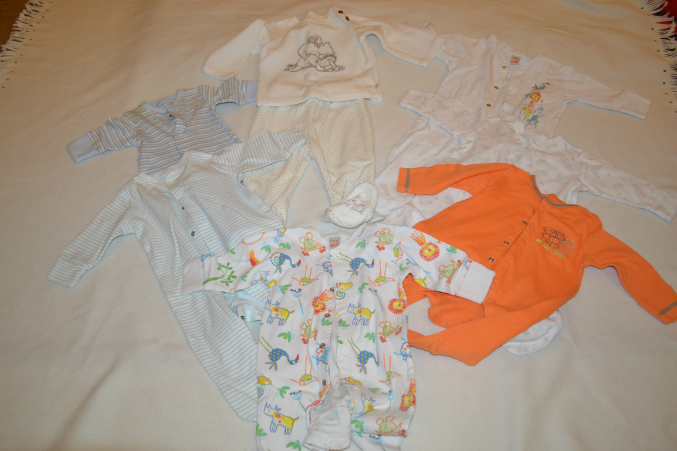 6 боди, 10 кофточек, 3 тонких штанишек, 3 плотных штанишек, 2 кофты с капюшоном, 6 слипов, велюровый костюм Винни Пух(новый).