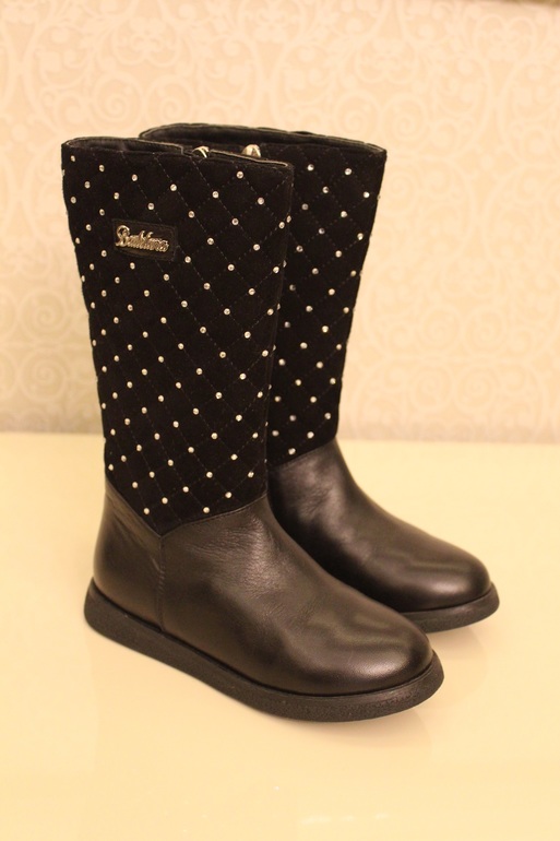 Обувь для девочекНовые сапожки замша простегана, в стежках стразики, кожа! Сапожки без коробки, обувь храню в гардеробной поэтому коробки сразу выбрасываю, но сложилось так что перебор по черной обуви.