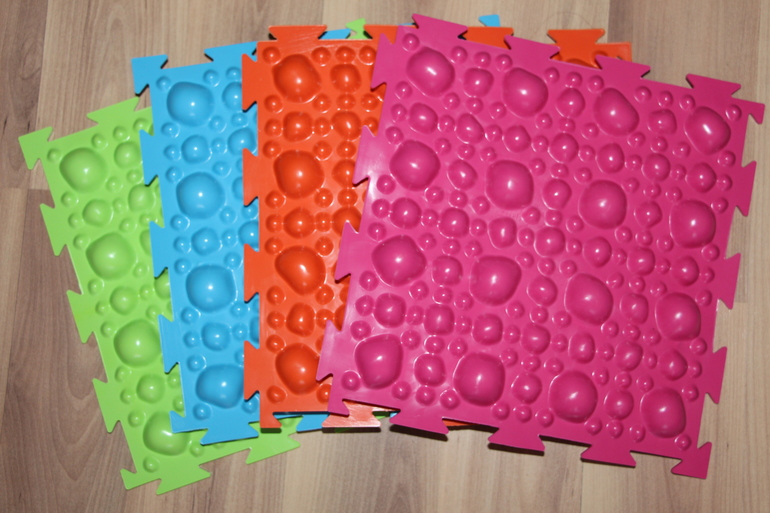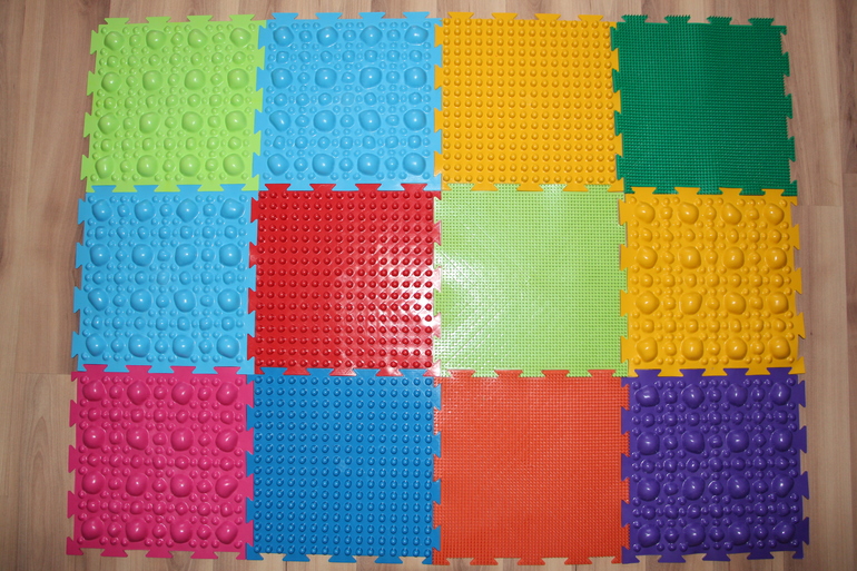Коврик имеет 4 вида массажной поверхности: мягкие камни, жесткие камни, шипы, трава.